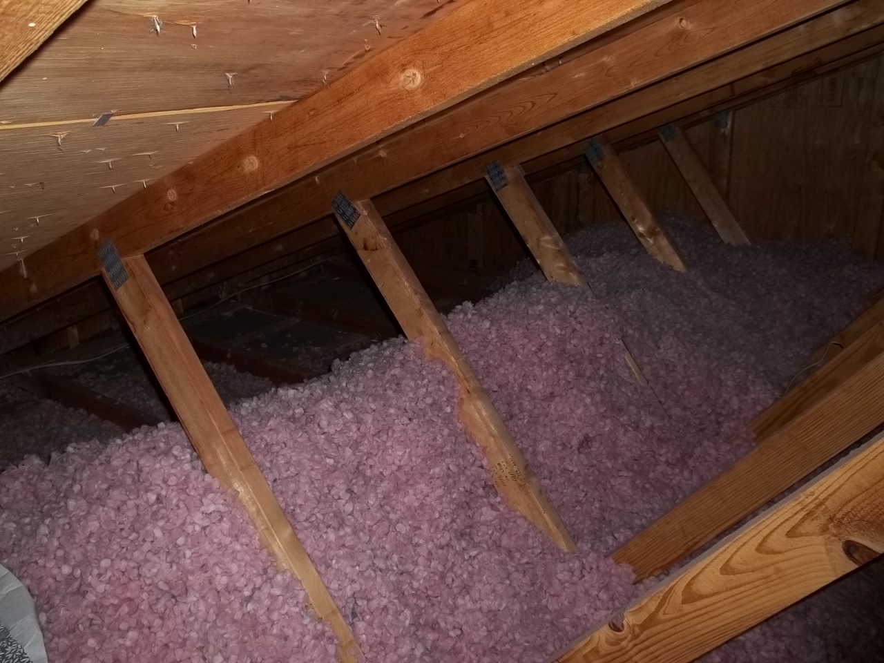 Blown insulation is out of place, appears to have been blown back from storms, this is visible in attic space at eave location. I was able to view the ceiling material in the area of the attic space where the insulation blew back from the eave.